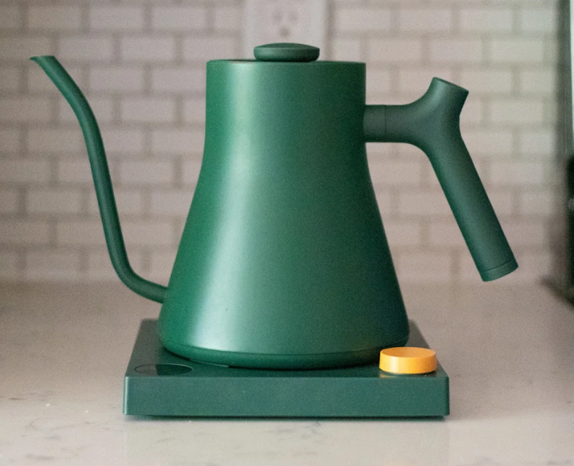 Great Jones x Fellow kettle in 'Broccoli with a pop of Mustard'. Designed for pour-over coffee.